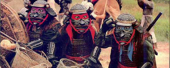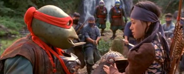O longa de 1993 apresentava um enredo mirabolante envolvendo uma viagem temporal para o Japão do início do século XVII. Ambiente para o qual as Tartarugas são transportadas (April também, lembremos) por meio de troca equivalente: isso quer dizer que duas pessoas com a mesma massa corporal devem segurar um cetro para “trocarem de tempo” e se transportarem pelas eras. Aliás, as duas pessoas devem, supostamente, estar segurando o tal cetro ao mesmo tempo. Pois é, duas pessoas de mesma massa corporal e em tempos diferentes devem segurar o cetro ao mesmo tempo. Isso poderia (veja bem, poderia) gerar uma discussão acerca de como se dá a passagem temporal, já que o fato de ter de “segurar o cetro ao mesmo tempo” conflita diretamente com a noção de tempo linear de grande parte das culturas mundiais e, principalmente, ocidentais. Um embate sobre como encarar o próprio Tempo e as eras do mundo como lineares, cíclicas ou coexistentes era uma forma de garantir um mínimo de sagacidade ao defeituoso roteiro. Contudo, nenhuma questão semelhante é levantada nos insuportáveis 96 minutos de película.
