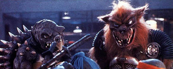 Além dessas mudanças e do roteiro consideravelmente mais infantilizado, o filme trazia dois vilões mutantes para enfrentar as Tartarugas. Agora, ao se falar de “dois vilões mutantes” a primeira ideia que vinha na cabeça da molecada eram os já conhecidos Bebop e Rocksteady, o javali e rinoceronte mutantes que, de fato, eram inimigos das Tartarugas, criados no desenho animado como figurantes e que acabaram caindo no gosto dos fãs. Em vez de utilizá-los, contudo, a produção do filme preferiu inventar outros, criados pelo Destruidor para enfrentar as Tartarugas de igual para igual, oriundos de outra tartaruga e um lobo e chamados, respectivamente, de Tokka e Rahzar. Já mais perto do final do filme, as Tartarugas, enquanto lutam contra Tokka e Rahzar, acabam dentro de uma apresentação mega-underground do… Vanilla Ice? Após segundos de estranhamento, o cara começa a cantar ao ritmo do conflito entre os mutantes. “Go, Ninja, Go, Ninja, Go”, ele cantava. Sério, Todd Langen (o roteirista)? Quer dizer… Que diabos foi aquilo? Logo depois, o inimigo número um das Tartarugas bebe o último frasco de ooze e se transforma no Super Destruidor (oooh!!) que morre sem dar um só golpe.