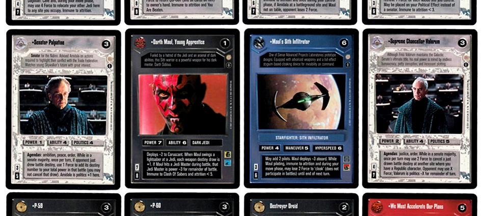 Este artigo começou como uma resenha. Estava prestes a discorrer sobre todos os diferentes tipos de cartas e elementos do Star Wars Customizable Card Game da Decipher Inc., mas percebi que a complexidade que se “arrastava” (como Mark Rosewater poderia dizer com Magic – The Gathering) para cobrir toda a série da Decipher transformava a resenha em um árduo projeto.