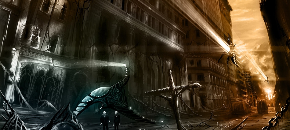 Depois de algumas poucas horas de caminhada estou entre prédios abandonados em ruas desertas e cobertas de vegetação. Encontro um canto confortável para uma pausa num antigo parque de diversões e alcanço em minhas costas um pacotinho de sorvete liofilizado8. Olho para o contator Geiger e vejo que ainda posso ficar por aqui mais uns dias sem grandes prejuízos para meu corpo. Guardo a tela de volta em meu backpack e percebo um esquilo olhando-me curioso. Que pequenino formidável, cinza de pêlos curtos e por mais que digam para não alimentar animais silvestres nem interagir com eles, não posso resistir à tentação. Claro que ao me aproximar ele recua um pouco, então eu avanço mais, e ele vai em direção à um beco. Não resisto; caminho em sua direção e… bam! Despenco na escuridão.